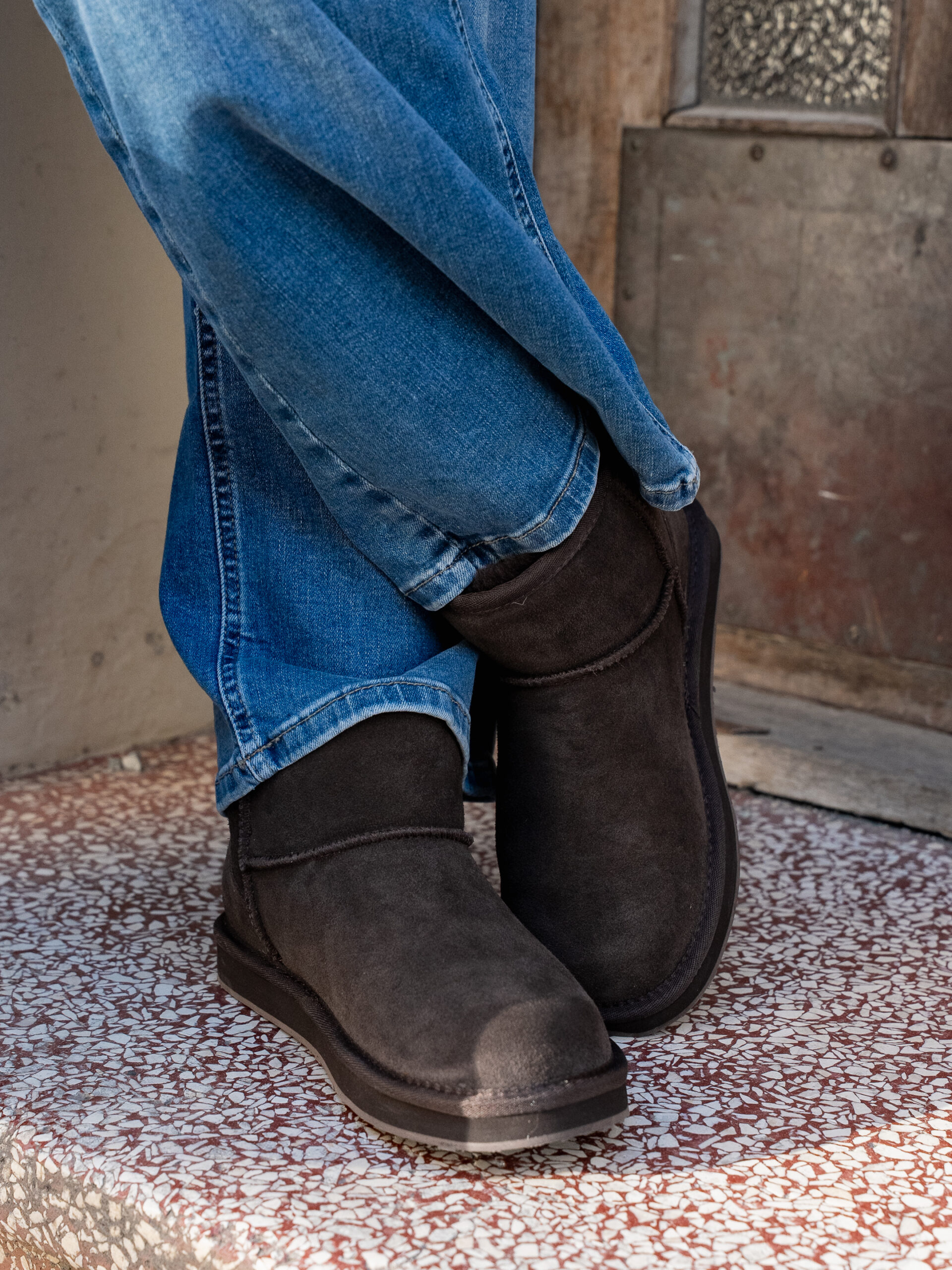 Asola Mid er ankelhøye slip-on-boots med semsket overdel og varmeisolerende fôr med ekte saueskinn og ull, som holder føttene dine varme på kalde dager. Modellen har rund tupp og flat yttersåle med knastemønster for godt grep på snø og is. Den lave, lettvekts gummisålen gir overlegen støtte, perfekt for både innendørs og utendørs bruk.