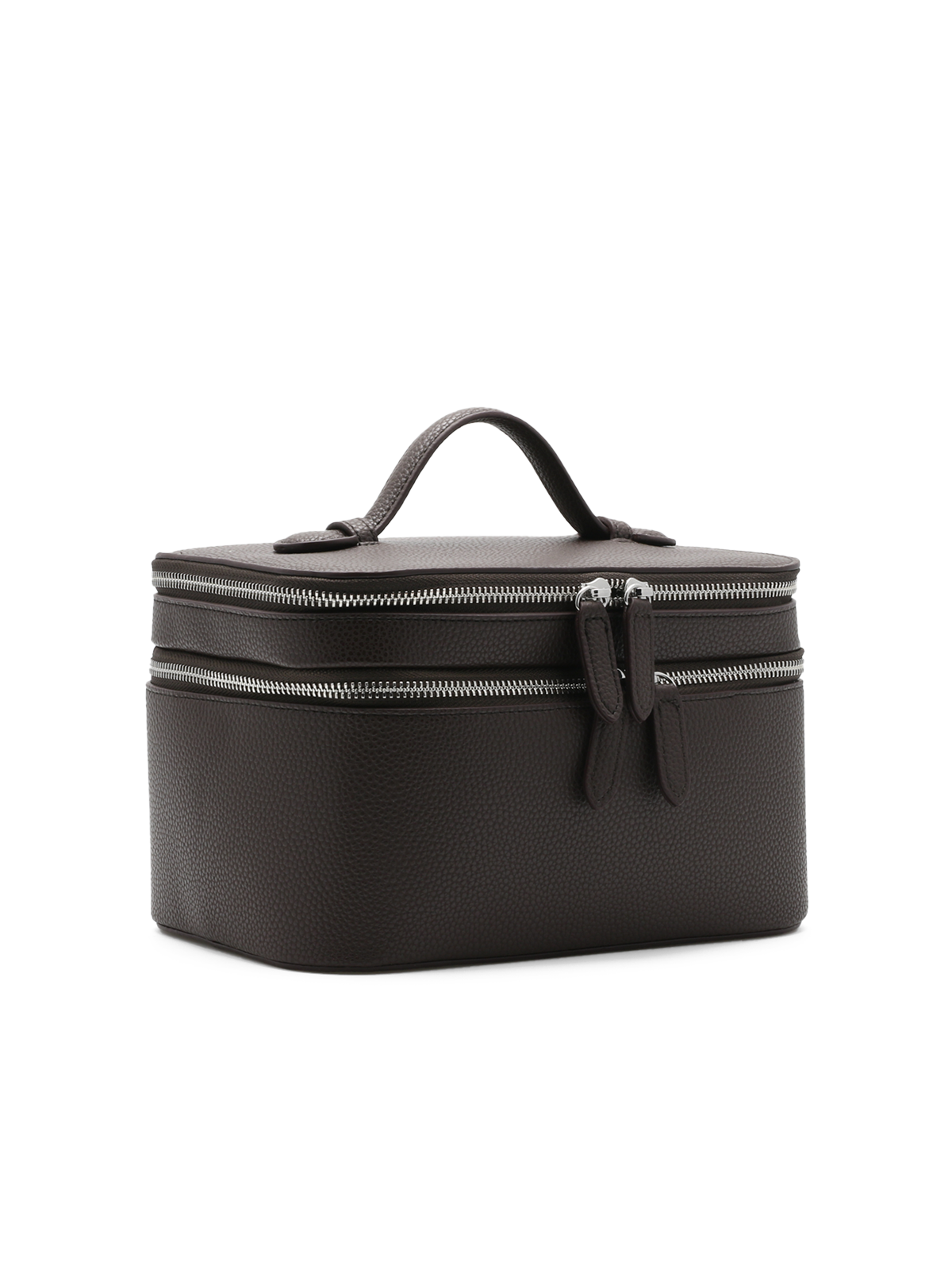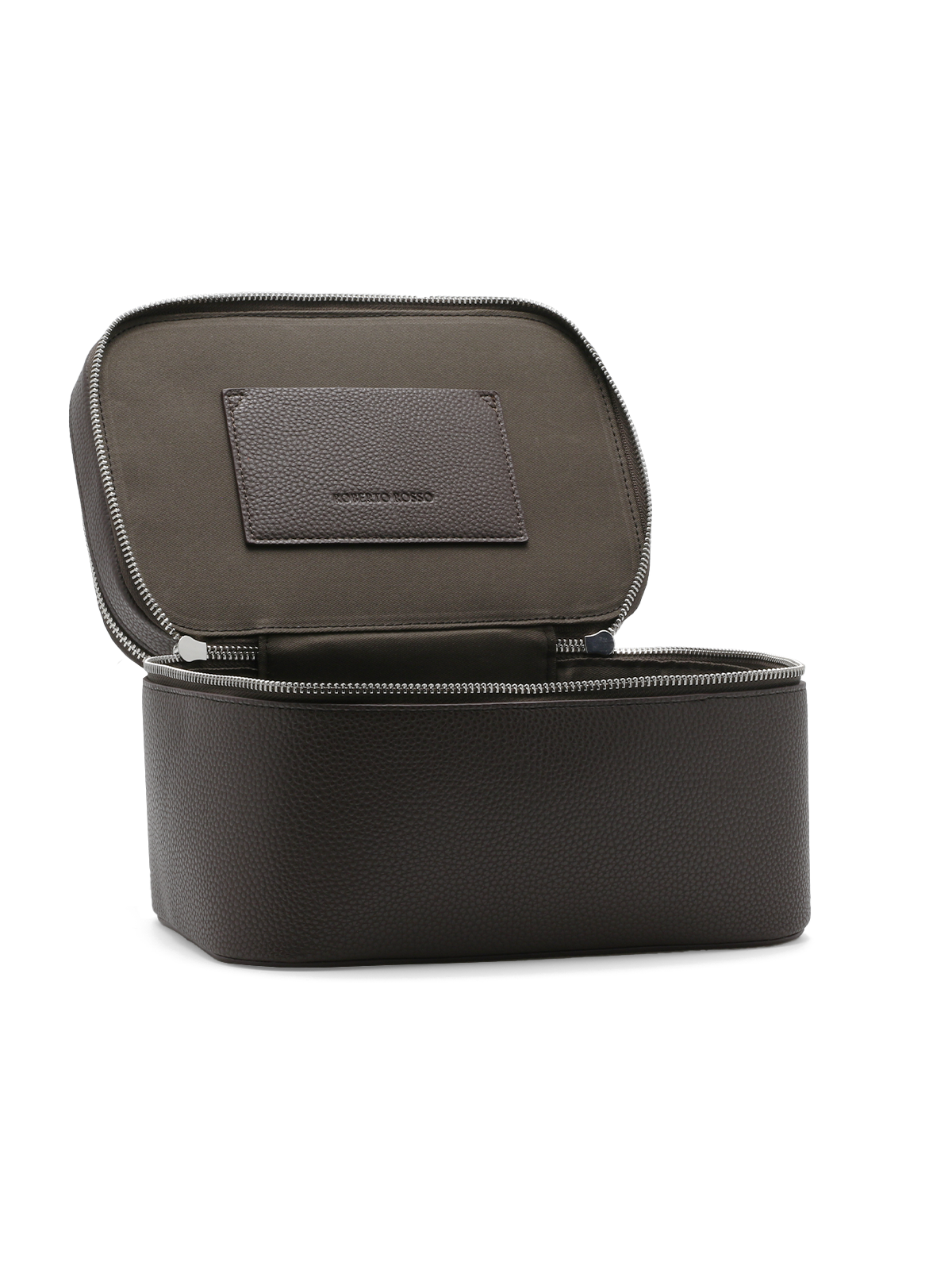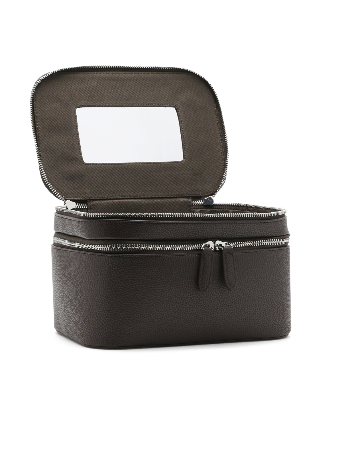 Terra Beauty Cosmetic Bag er en romslig toalettmappe med et klassisk og praktisk design. Modellen er laget i imitert skinn med strukturert overflate som gir en eksklusiv finish. Toalettmappen har to separate rom med glidelås som gjør det enkelt å organisere sminke, hudpleie og toalettsaker. Det øverste rommet har speil i lokket og holder til sminkekoster, mens det nederste rommet har praktisk inndeling. Perfekt til oppbevaring av skjønnhetsprodukter for å ta med på reise eller ha stående på baderommet.