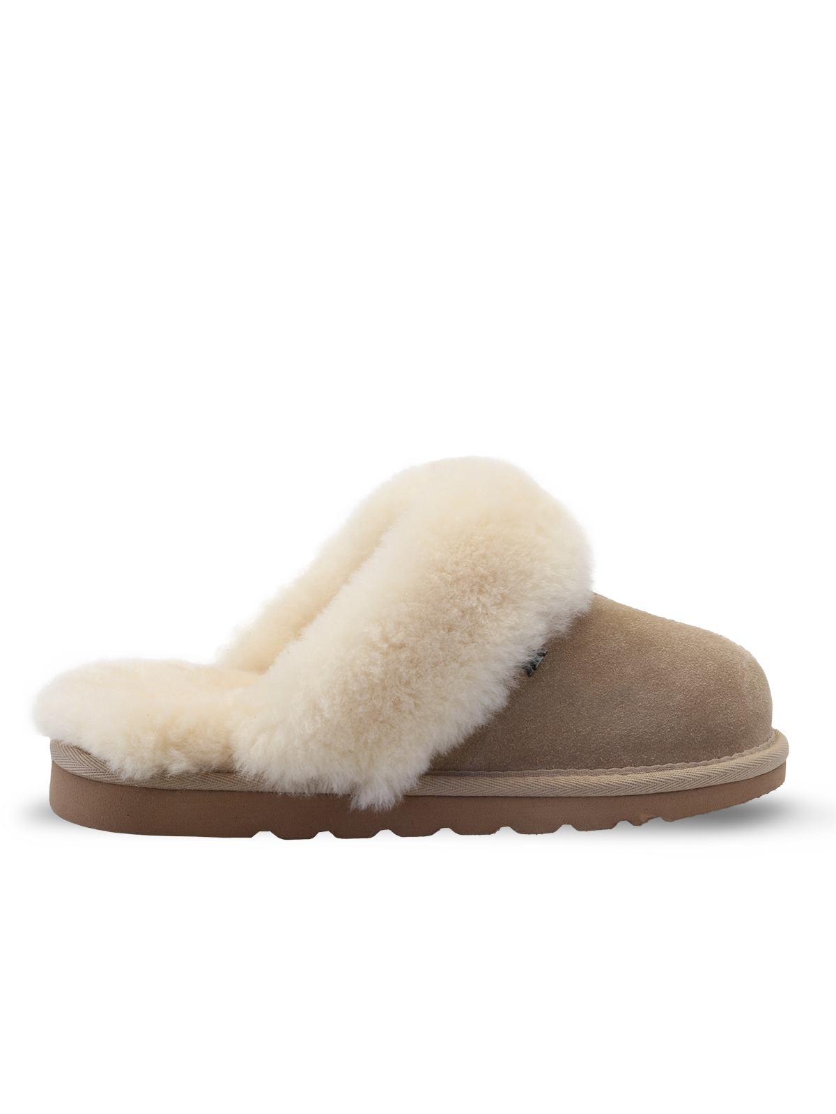 Myke slip-in tøfler med bred krage i korthåret saueskinn og innvendig varmt fôr. Modellen har en lett såle med mønstret underside og kantebånd i tekstil. Dekorert med et lite logoemblem i gull.